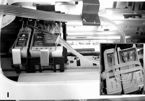 從理論上說(shuō),所有的噴墨打印機(jī)都可以使用連續(xù)供墨,但是受到一些打印機(jī)自身?xiàng)l件的限制和目前連續(xù)供墨套件開(kāi)發(fā)及適應(yīng)范圍的限制,所以連續(xù)供墨目前還是主要集中在EPSON(愛(ài)普生)的所有型號(hào)中。Canon(佳能)分體墨盒型號(hào)的打印機(jī)連續(xù)供墨套件與EPSON的很相似(圖1),但由于種種原因開(kāi)發(fā)得較遲緩。HP(惠普)和LEXMARK(利盟)以及Lenovo(聯(lián)想)等噴頭和墨盒一體化的打印機(jī),墨盒是越做越小,現(xiàn)在很多機(jī)型受到機(jī)器內(nèi)部空間狹小、輸墨管線難于隨墨盒運(yùn)動(dòng)的自身?xiàng)l件限制,加之噴頭使用壽命等原因增大了改裝難度,使用連續(xù)供墨的實(shí)際意義不大。而使用78號(hào)彩色墨盒的這種“大墨盒”HP打印機(jī),如果將它改為連續(xù)供墨倒還是不錯(cuò)的(圖2)。本文以下所講到的連續(xù)供墨,均是以EPSON噴墨打印機(jī)為例。