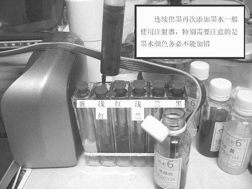 3.打印機(jī)使用連續(xù)供墨系統(tǒng)以后的日常保養(yǎng)工作不可忽視以下幾點(diǎn):①打印機(jī)擺放位置不能被日光直接照射,同樣,外墨盒盡量不要長(zhǎng)期被紫外線照射,以免外墨盒墨水保存時(shí)間縮短,如果受使用條件的限制,可以將外墨盒做遮光處理或者選用外墨盒有防紫外線盒子的連續(xù)供墨。②外墨盒上都有通氣孔,打印機(jī)的使用環(huán)境就需要注意防塵工作。③打印機(jī)不能長(zhǎng)期不使用。噴頭在打印中是否有斷線,與氣候、環(huán)境、墨水質(zhì)量、自身狀況等都有關(guān)系,最好每半個(gè)月至少使用1次,氣候特別干燥的地區(qū)每周至少使用1次,如確實(shí)無(wú)打印任務(wù),可以打開(kāi)打印機(jī)電源后,打印一張噴嘴檢查圖以便確定噴嘴狀況。④外墨盒再次添加墨水方法按照說(shuō)明書(shū)操作即可,需要注意的是打印機(jī)外墨盒的墨水最好不要使用一點(diǎn)就馬上添加,墨水存放有一個(gè)保質(zhì)期,每色使用到一定極限再添加為好;添加墨水的時(shí)候也要注意不要加得過(guò)滿,更不能添加錯(cuò)顏色(圖14)。⑤不同牌子的墨水不要混用,如果要換其他牌子墨水,應(yīng)將外墨盒中的墨水抽干后再更換,顏料墨水和染料墨水之間需要互換,應(yīng)當(dāng)先將整個(gè)連續(xù)供墨系統(tǒng)的墨水都抽干凈并進(jìn)行清洗。