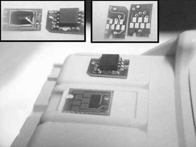 二是墨盒芯片對(duì)位不準(zhǔn)確沒(méi)有被打印機(jī)檢測(cè)到。目前國(guó)內(nèi)永久芯片沒(méi)有一個(gè)統(tǒng)一標(biāo)準(zhǔn),比如芯片的體積大小和厚薄,當(dāng)更換另一種芯片后,由于體積大小和厚薄的不一致,造成打印機(jī)無(wú)法檢測(cè)到芯片;還有一些內(nèi)墨盒上芯片放置位置做工上的精確度不高,這樣就或多或少影響到芯片在墨盒上的固定點(diǎn)的精確度;當(dāng)然墨盒標(biāo)準(zhǔn)尺寸不夠也會(huì)造成與打印機(jī)的彈簧接觸點(diǎn)對(duì)位不準(zhǔn),使打印機(jī)無(wú)法檢測(cè)到永久芯片(圖13)。