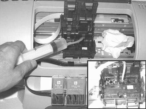 ②拔下軟管,將注射器和軟管清洗干凈,抽取清洗液或者純凈水后再次將軟管插入墨車(chē)上噴頭的吸墨柱,輕輕壓入2毫升水,水從墨車(chē)下流出,即刻用紙巾將水吸干(圖15)。如果感覺(jué)壓入的力量很輕,說(shuō)明噴頭已通,如果感覺(jué)費(fèi)力,再次輕輕壓入2毫升。最后,可以抽取1毫升相同顏色墨水壓入噴頭。